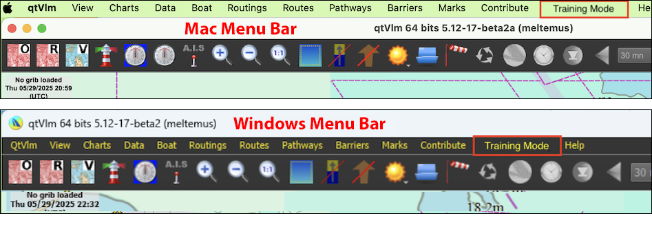 Step 3.Close qtVlm if open, and then reopen the program, and you will see a new item in the menu bar, called "Training Mode." Click that menu item and choose "Download and Activate."
